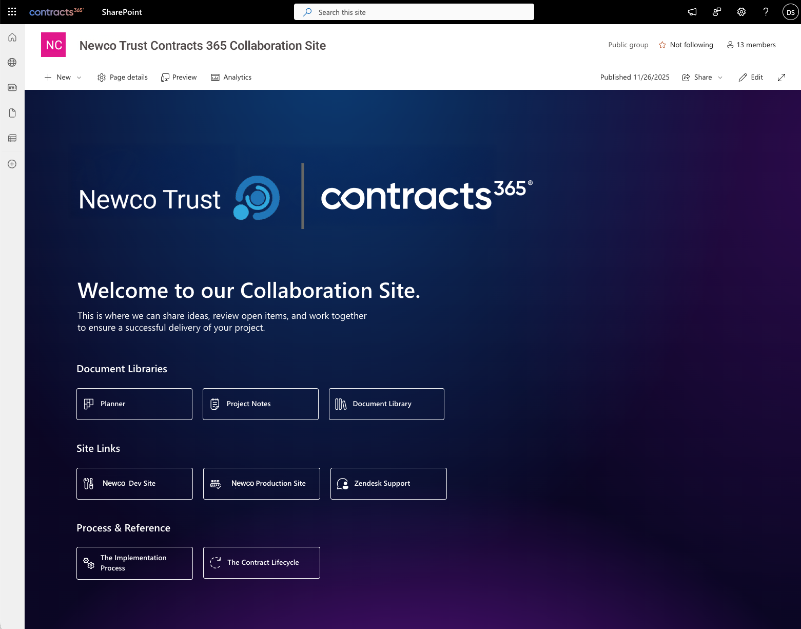 That’s why we build every customer a Contracts 365 Collaboration Site: a dedicated space for your project team and ours to stay aligned as we configure, customize, and continually enhance your Contracts 365 environment.